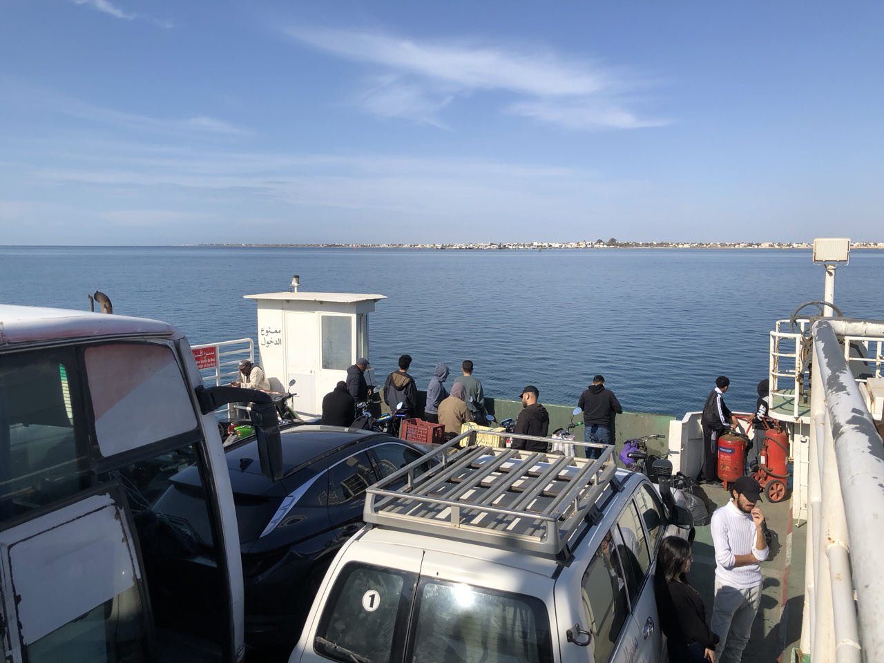 Terwijl onze dromedarisdrijver één van de dromedarissen naar zijn kudde bracht, maakte onze kok ons een laatste lunch. De overgebleven dromedarissen, degene die sowieso een muilkorf tijdens het wandelen droeg, was hoorbaar boos. Hij gromde bijna constant keelgeluiden. Dromedarissen zijn kuddedieren en zijn dus niet graag alleen, maar dit dier wist, doordat de andere weggebracht werd naar de kudde, dat hij nog moest werken... Hij moest wel niet zo veel meer dragen als 's ochtends. Onze chauffeur werd ondertussen gebeld en toen hij er was met zijn jeep, werd deze ingeladen met onze spullen en allerlei spullen die de dromedarissen de dagen voordien steeds gedragen hadden. We namen afscheid van onze dromedarisdrijver en van de Sahara en reden, samen met onze kok (de broer van onze chauffeur) naar het depot van 'Agence Alyssa' waarmee we in Tunesië de hele reis ondernamen... en wat waren we blij dat we, na onze tijd in de woestijn, op de achterbank van de jeep konden zitten... terug zitten met een rugleuning en met onze voeten lager dan de rest van ons lijf... :-DAlvorens Douz te verlaten ging Ine nog (véél) Tunesisch zoets inslaan... zalabiya's, qarn al-ghazals, makroudhs en nog iets. Ine had zo veel gekocht dat ze twee bambalouni's gratis kreeg...Het zou vier uur duren vooraleer we van Douz naar ons hotel in Houmt Souk, op Djerba, gereden waren. Het was een dikke 200 km rijden en we moesten de overzetboot naar het eiland Djerba nemen.