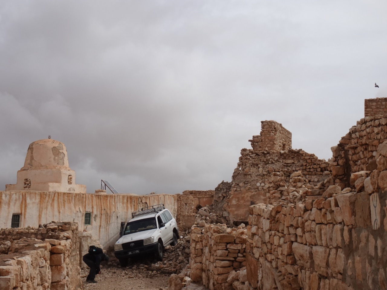 Met het 'herleggen' van de keien en de instructies van Johan slaagde chauffeur er in om over het ingestorte huis te rijden... Dit was al de tweede vakantie op rij dat Johan zulke wegenwerken en hulp moest bieden: In Zuid-Cyprus had hij dit ook voor Ine moeten doen toen we een kerk in de middle of nowhere gingen bezoeken (blogbericht).Enfin, we verkenden Zeraoua verder. Het was echt een groot dorp! Spijtig dat iedereen er weggetrokken is... maar begrijpelijk ook natuurlijk... maar zo verdwijnt, net als in al de andere dorpen in het Dahargebergte, toch ook veel van de cultuur van de Berbers.