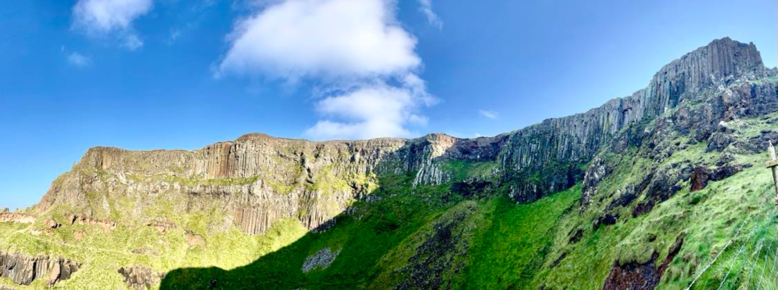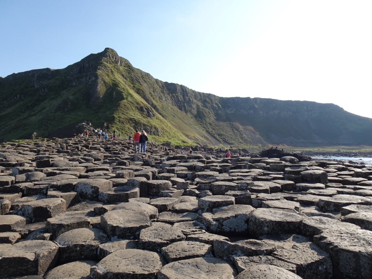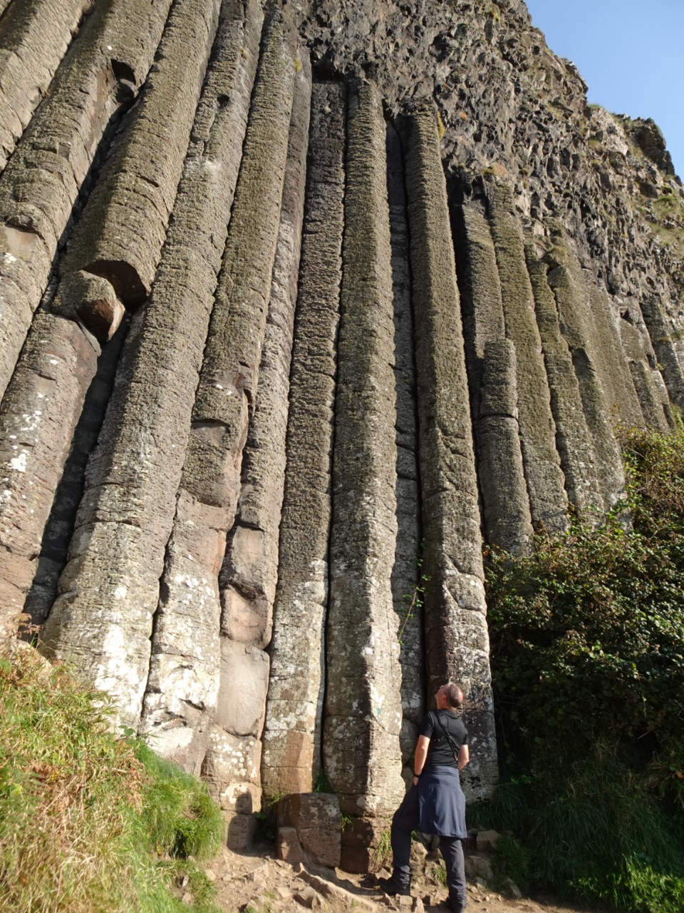 We verkenden zo veel mogelijk van de véle basaltzuilen en maakten massa's foto's... helaas staan er ook op foto's die we zonder volk wilden, net heel veel volk... Het droge en goede weer maakte ook dat de basaltzuilen droog waren. Dit maakt ze natuurlijk minder zwart, wat minder contrast geeft op foto's... Na dat "reuzenzeepad" wandelden we nog verder langs de kust. Zo kwamen we bij de gigantische 'orgelpijpen' en het 'Amphitheatre'. Dit natuurlijke amfitheater is een half ronde klif met verschillende partijen basaltzuilen. Helaas kon je daar niet verder dan het begin ervan lopen... maar mooi, zeg!