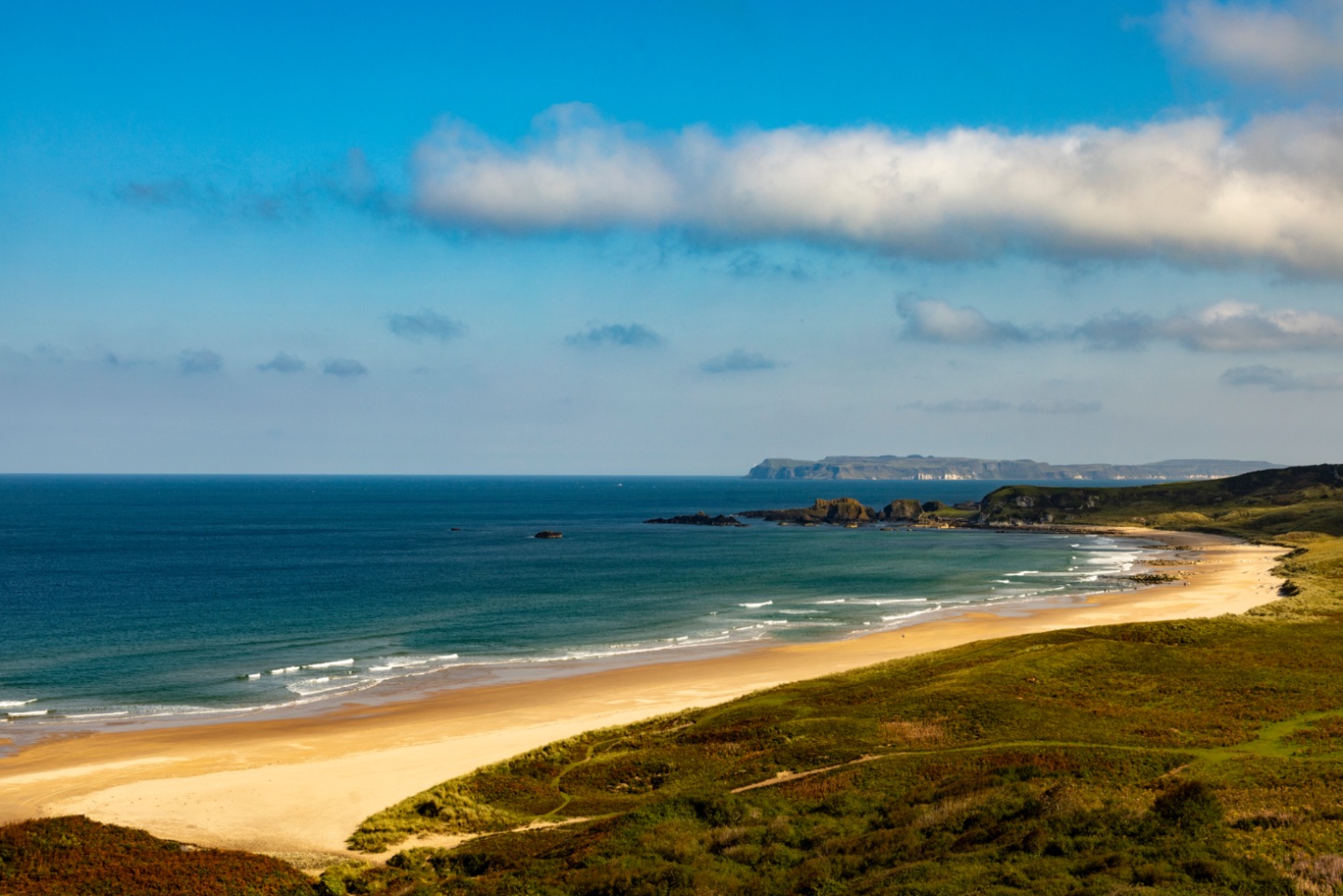 Terug naar de kust, in Whitepark Bay, stond een strandwandeling op onze planning. Ine had daar niet zo'n zin in... vooral omdat ze dan wéér zoveel trappen naar beneden (maar vooral weer terug naar boven) zou moeten gaan doen. Ze vond dat ze al genoeg trappen gedaan had die ochtend... We zagen wel, van boven, dat het een breed en lang "gouden"zandstrand was.