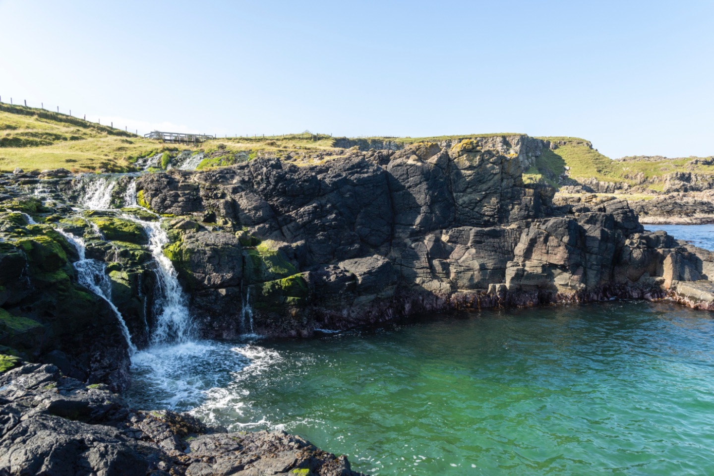 Verder gingen we op zoek naar de Dunseverick Falls... deze watervallen stonden enkel in onze Crossbill Guide. Ze werden ook niet aangeduid vanaf de rijweg en vanaf een wandelpad was het ook niet duidelijk aangegeven... Logisch dus dat deze waterval dus niet echt 'bekend' is. Andere wandelaars in de buurt liepen er ook gewoon, enkele tientallen meters boven op het wandelpad, voorbij... maar het was echt een "schoontje", die Dunseverick waterval. Ze stroomt breed uit over de rotswand de zee in.