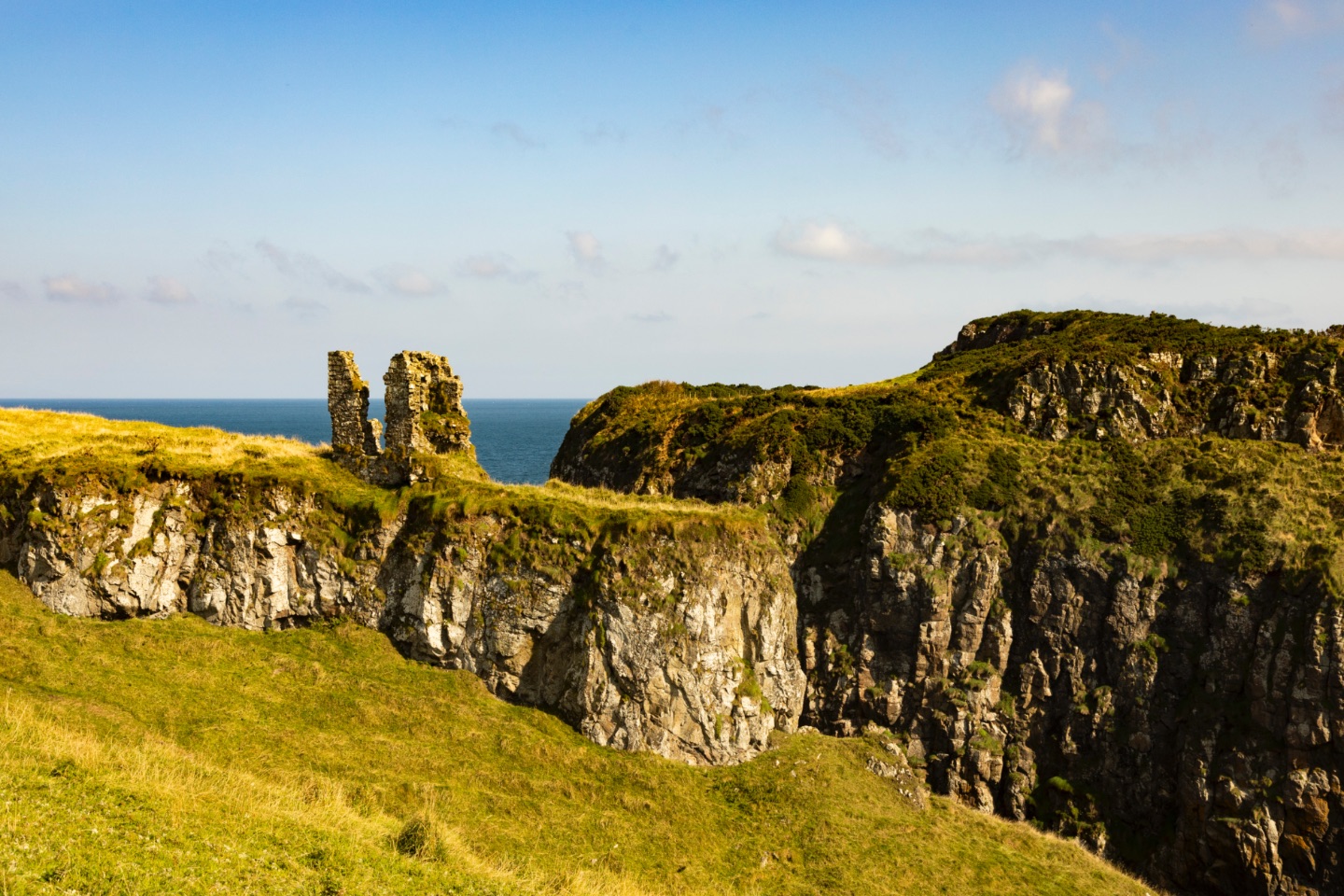 Zoals iedere ochtend waren we al vroeg op weg. Na 5 km konden we wel alweer parkeren. We parkeerden bovenaan een klif vanwaar we Kinbane Castle konden zien liggen. Ondertussen zagen we vanop die kliffen niet meer de Ierse Zee, maar de Atlantische Oceaan.