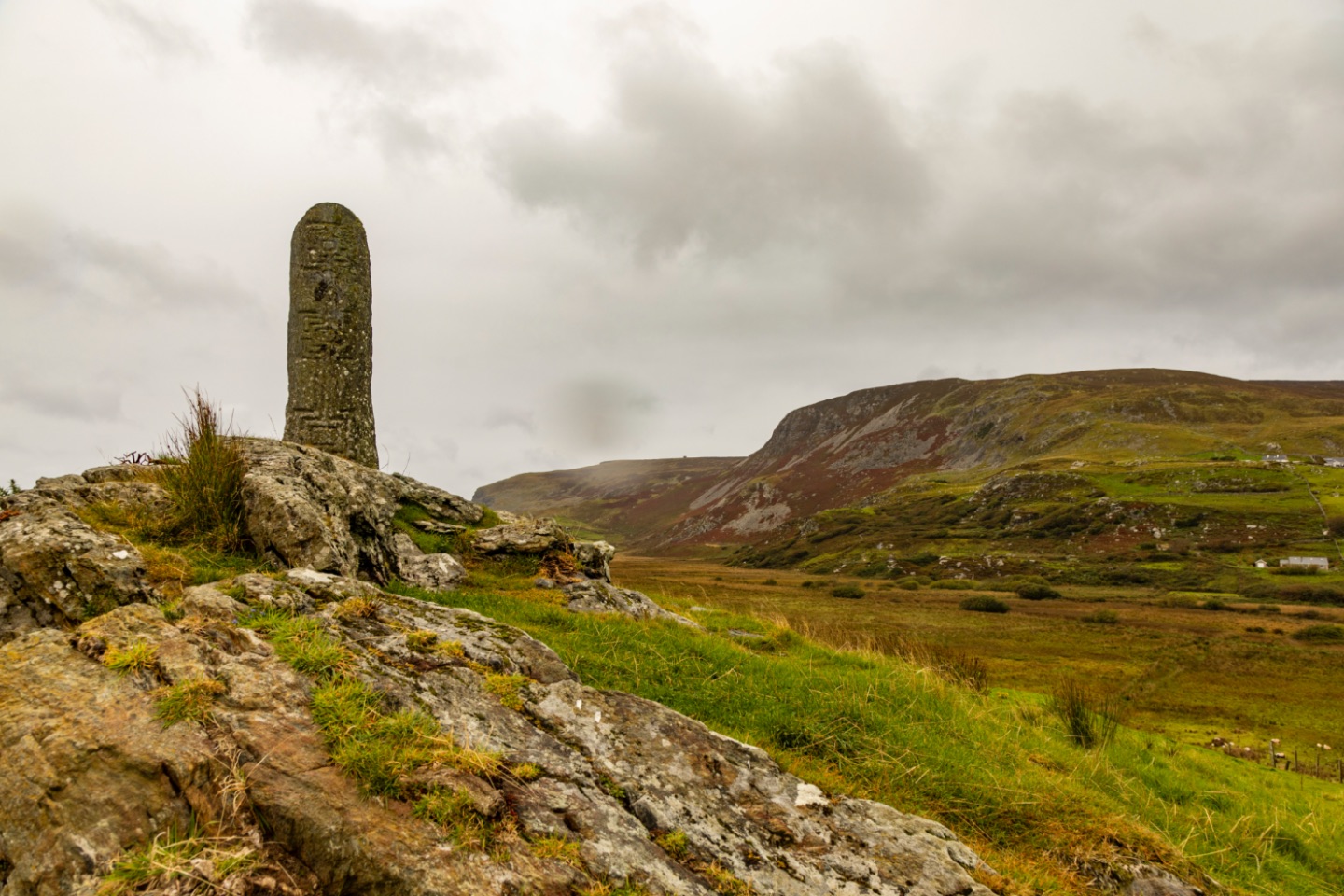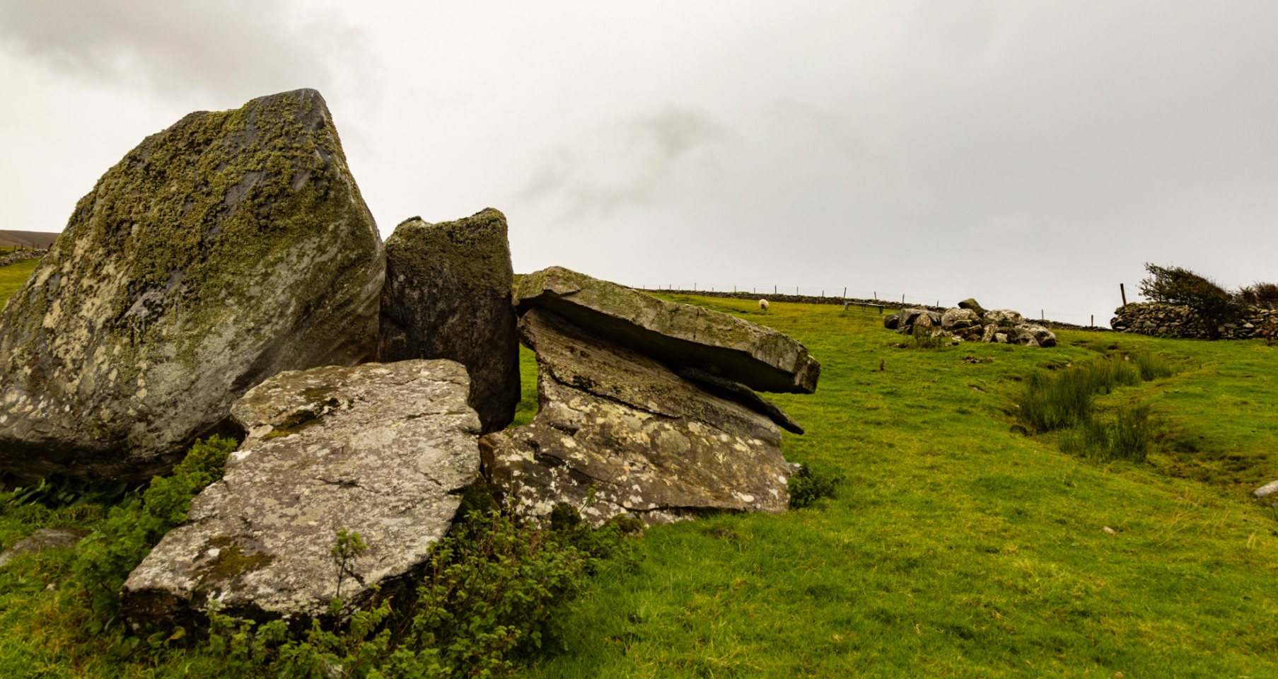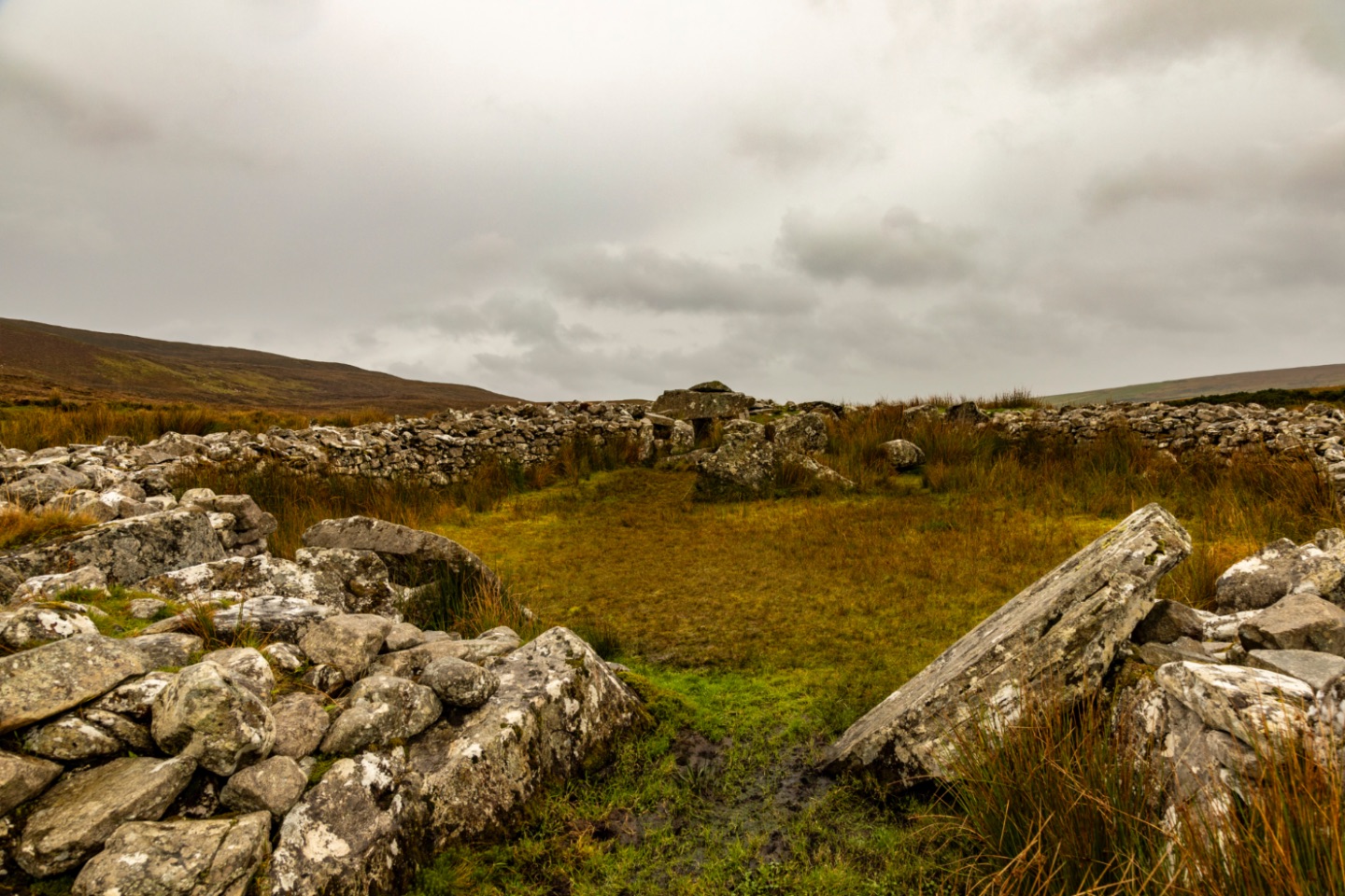 Malinmore Meghalitic Cemetery" was onze volgende stopplaats nadat we onze wandeling gestaakt hadden. Terwijl het nog steeds regende en we al flink nat waren, stapten we voor dit monument een schapenwei in, vlak naast het erf van een boer.