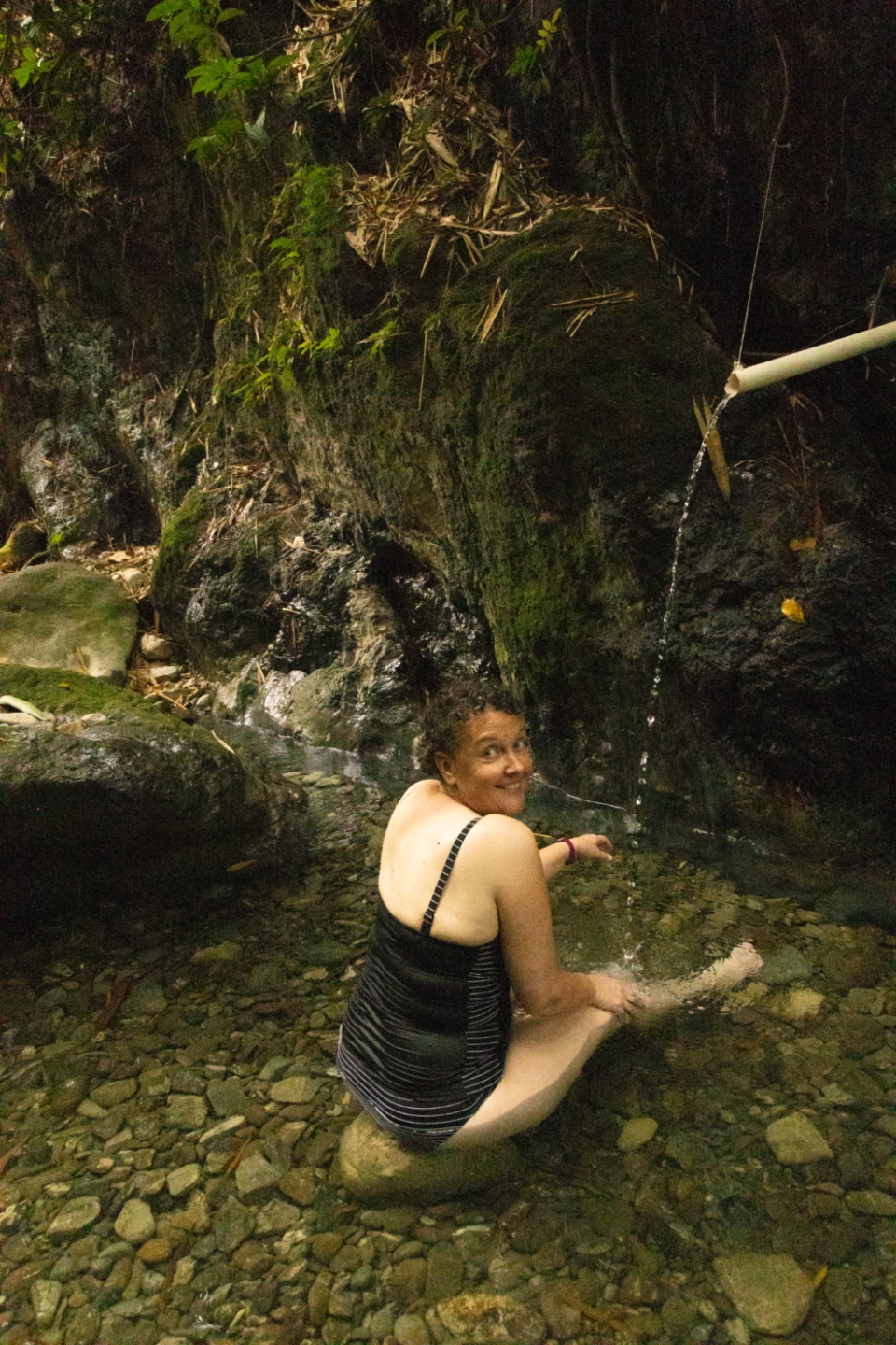 We moesten over een plakkerige helling wandelen en over een beek, daar waar die op z'n smalst was, stappen tot we aan de warme stromen kwamen. Het warme water liep langs de rotsen, werd via kanaaltjes vervoerd naar waterbekkens en kwam uit aangelegde pijpen waardoor het een soort douches vormde.