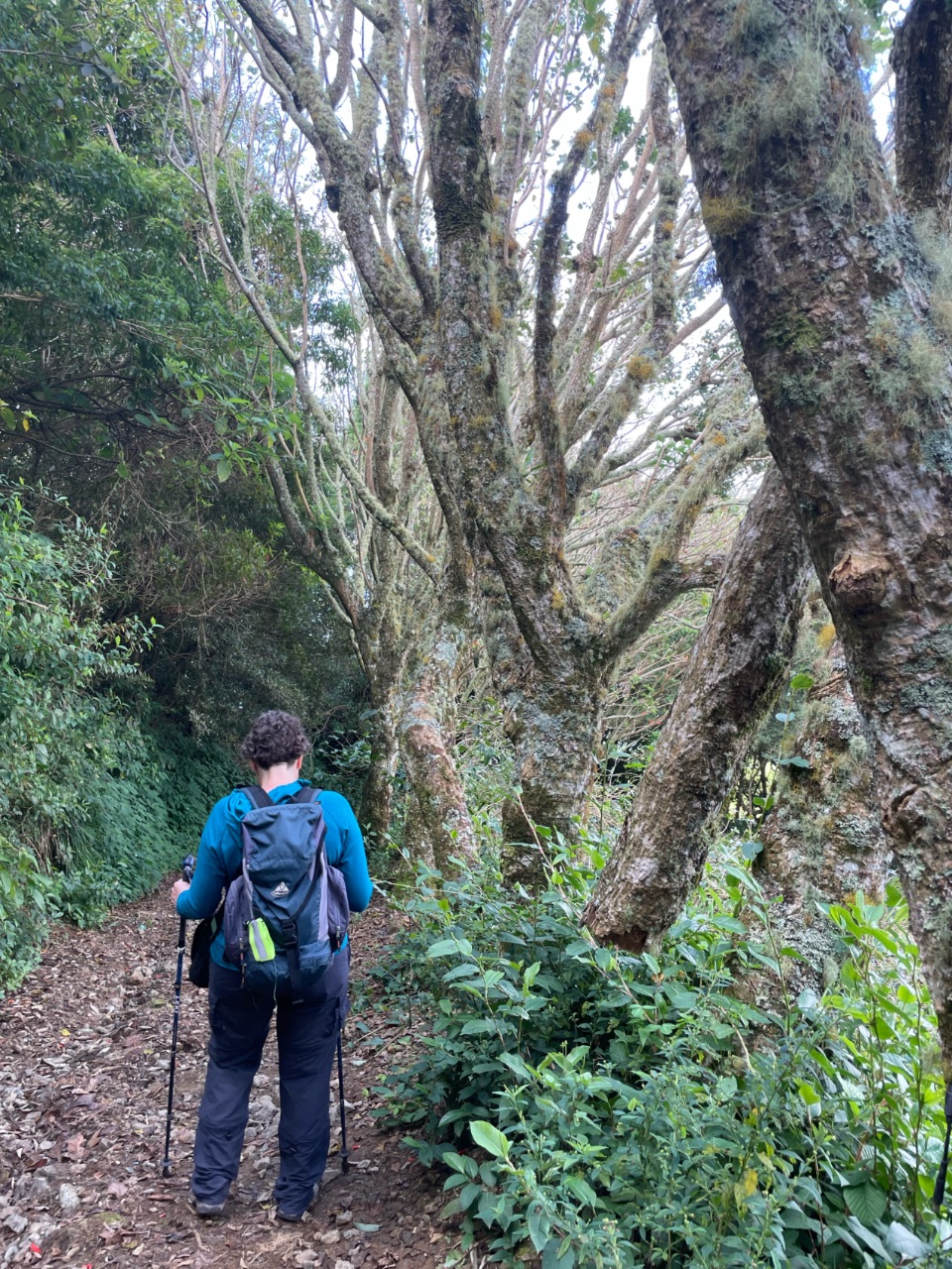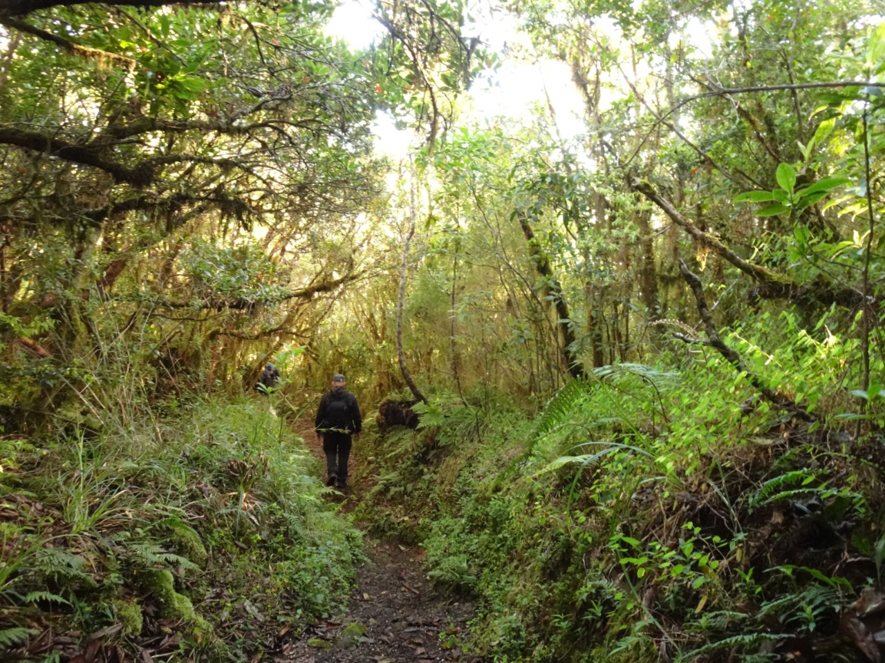 De afdaling was compleet anders dan het klimmen: we zágen iets: Zoals hier en daar op websites beschreven staat, leek het inderdaad op een elfachtig bos met knoestige bomen die bedekt zijn met hangende mossen en verschillende soorten varens. Weer wat lager werd dit dikke vegetatie, ook boven ons, in allerlei tinten groen, de ene tropische plant na de andere: mooi! Er waren niet veel bloemen. We zagen ook maar één kolibrie en verder niets.