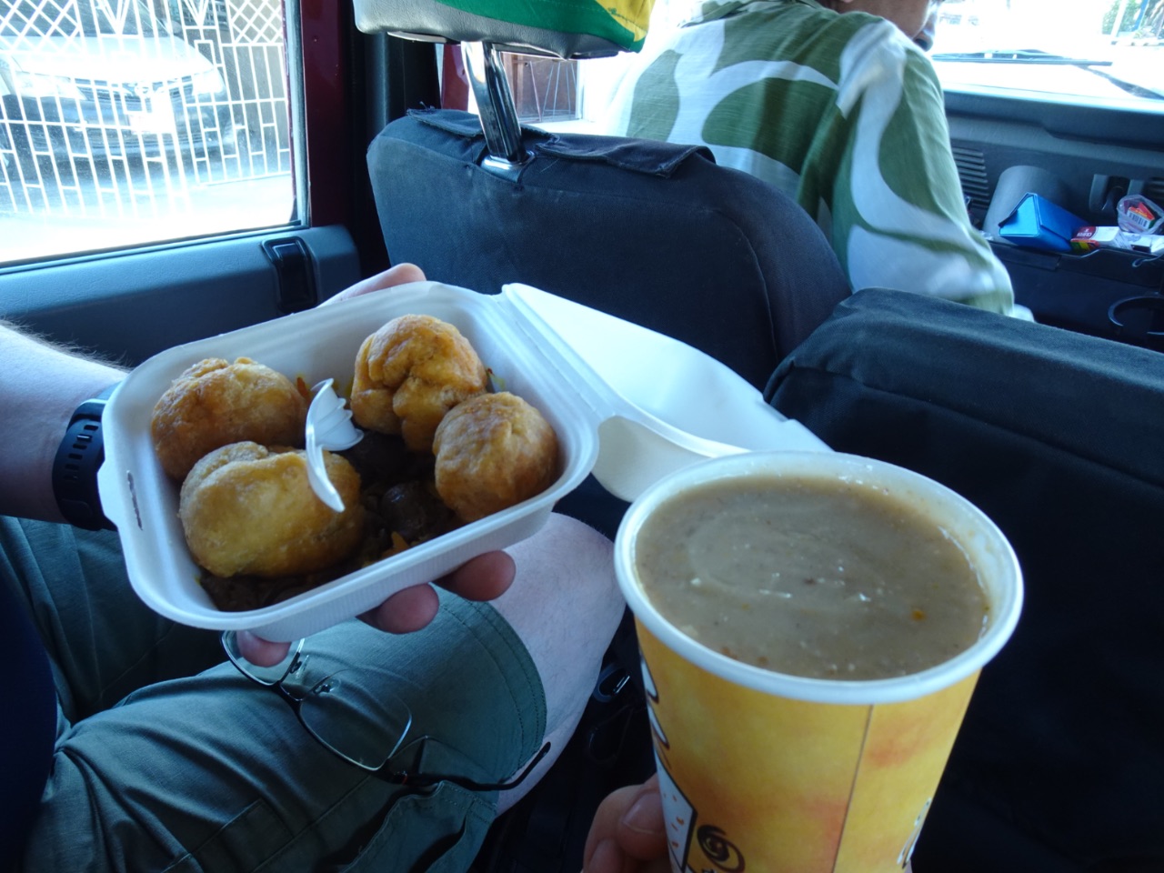 Tracey had geen ontbijt voorzien omdat ze ons wilde tracteren op een ontbijt van een bevriende man met een restaurantje waar ze ook regelmatig eens iets haalden. Johan nam dumplings met groenten, Ine warme bakbananenpap : beide typisch Jamaicaanse ontbijtgerechten... en lekker!