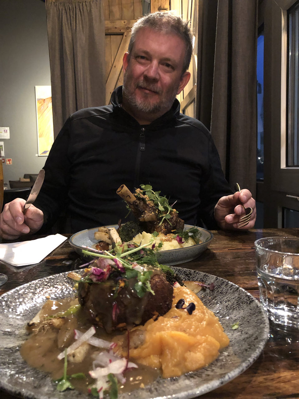 Er was een uitgebreide keuken in Kef Guesthouse maar Johan, tot thuis, verlof gekregen om te koken. We reden 's avonds terug naar Hafnarfjörður om te gaan eten in een restaurant dat erg goede beoordelingen kreeg, KRYDD. Johan at er zalm als voorgerecht en lamsbout als hoofdgerecht, Ine een 'steak' van noten. Onze verwachtingen werden ingelost: het was echt heel lekker! Krydd betekent overigens specerijen.
